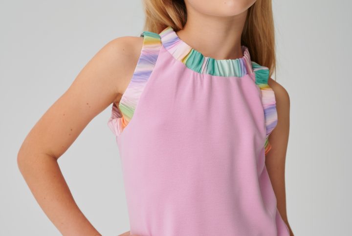 Model 144 cm boyundadır ve 9-10 yaş beden giymektedir.