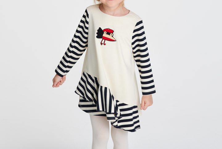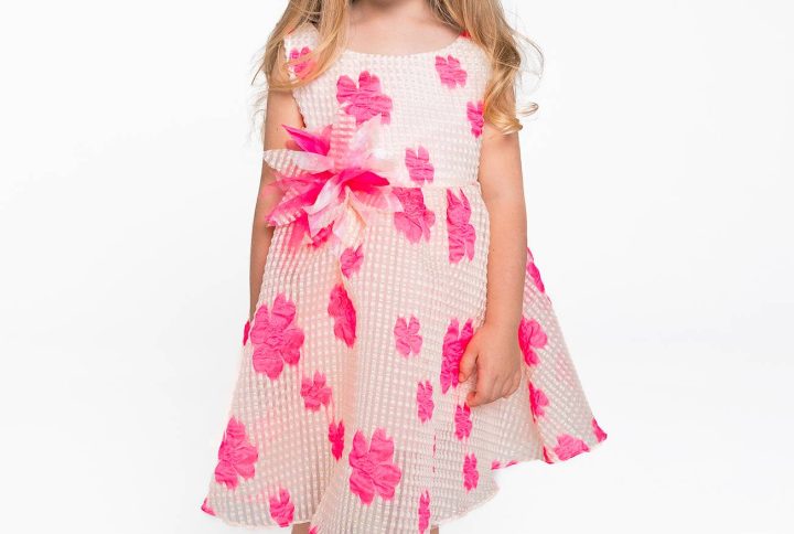 Şeker pembesi düşük kollu kız pamuk elbisesi. Beli kendinden lastiklidir.