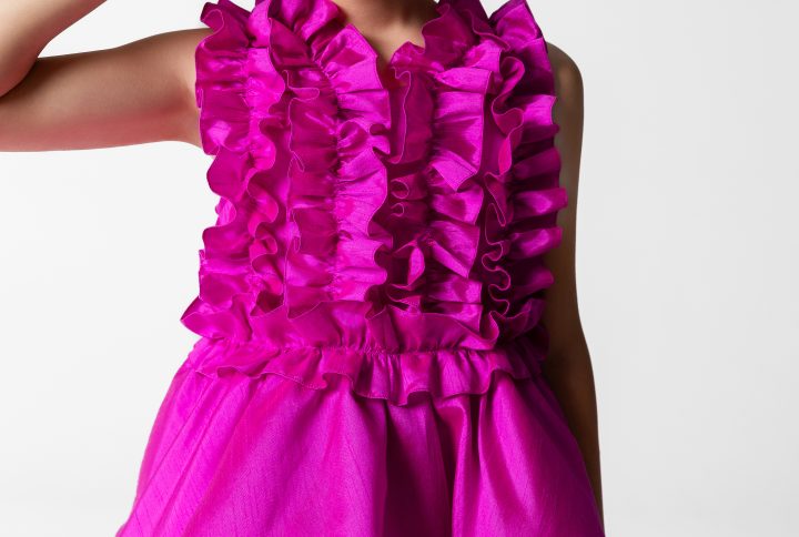 Tafta göğüs kısmı fırfır detaylı özel gün kız çocuk elbisesi. %100 pamuk astarlıdır ve arkadan fermuarlıdır.