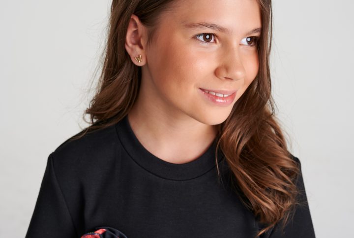 Kalın siyah kumaşlı ve belinde lila kalp detayı bulunan pileli kız çocuk şortu.