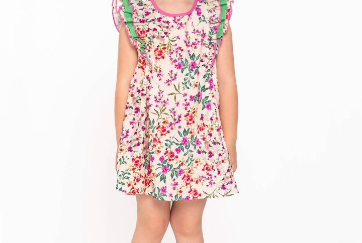 Pembe çiçekli jakar kumaştan tasarlanmıştır. Belinde çiçek detayı vardır ve elbise pamuk astarlıdır.