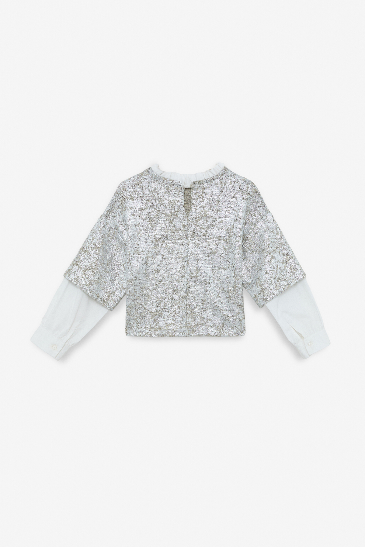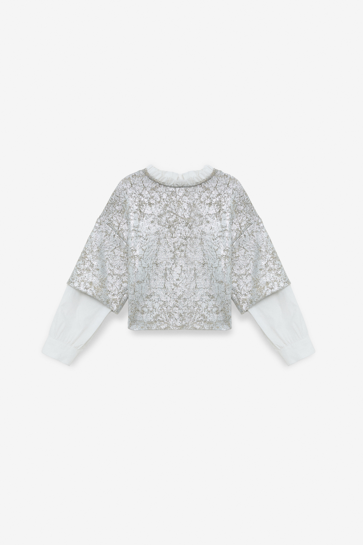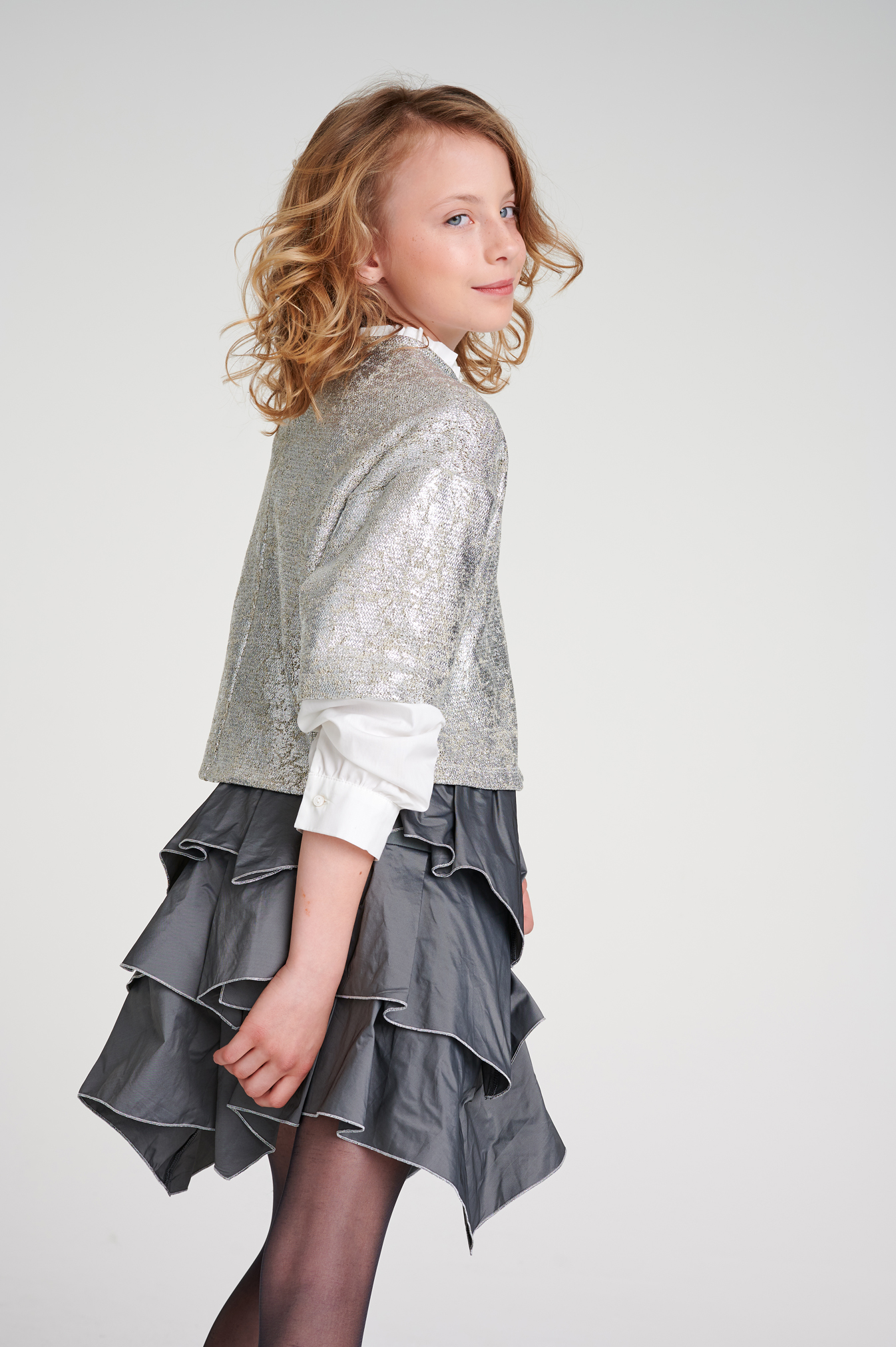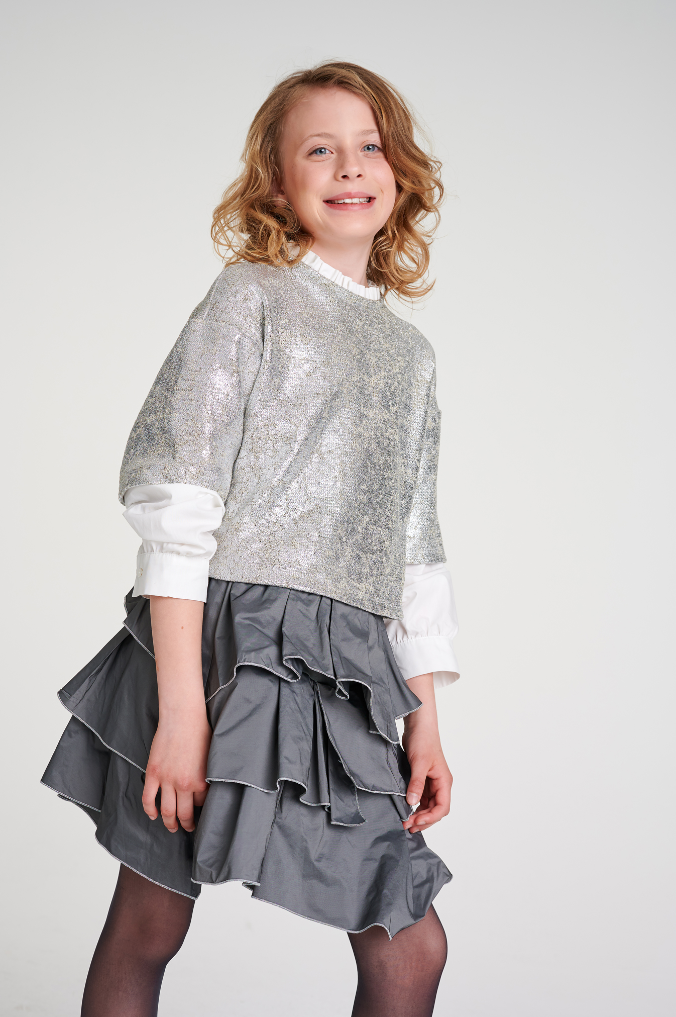 Model 144 cm boyundadır ve 9-10 yaş beden giymektedir.